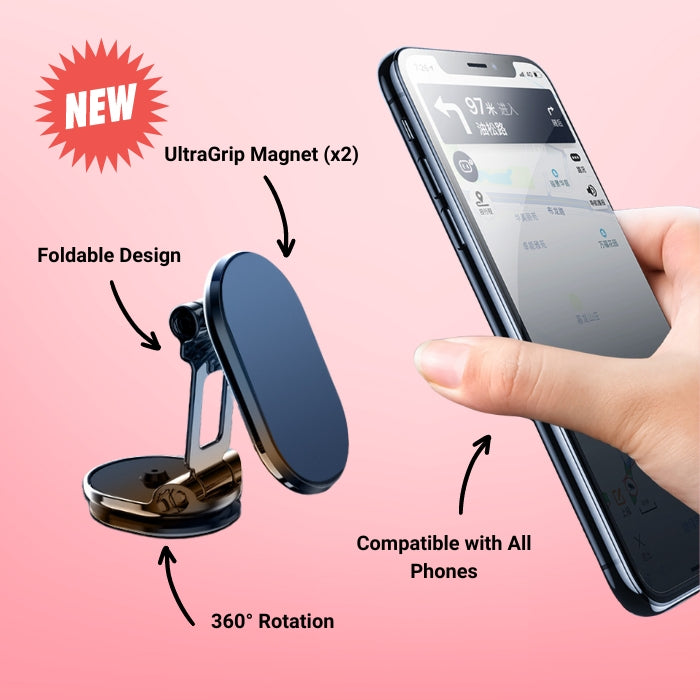 Introducing the UltraGrip Magnetic Car Phone Holder. With ultra-strong N52 magnets and a sleek, foldable design, it grips your phone firmly, no matter how rough the road gets.